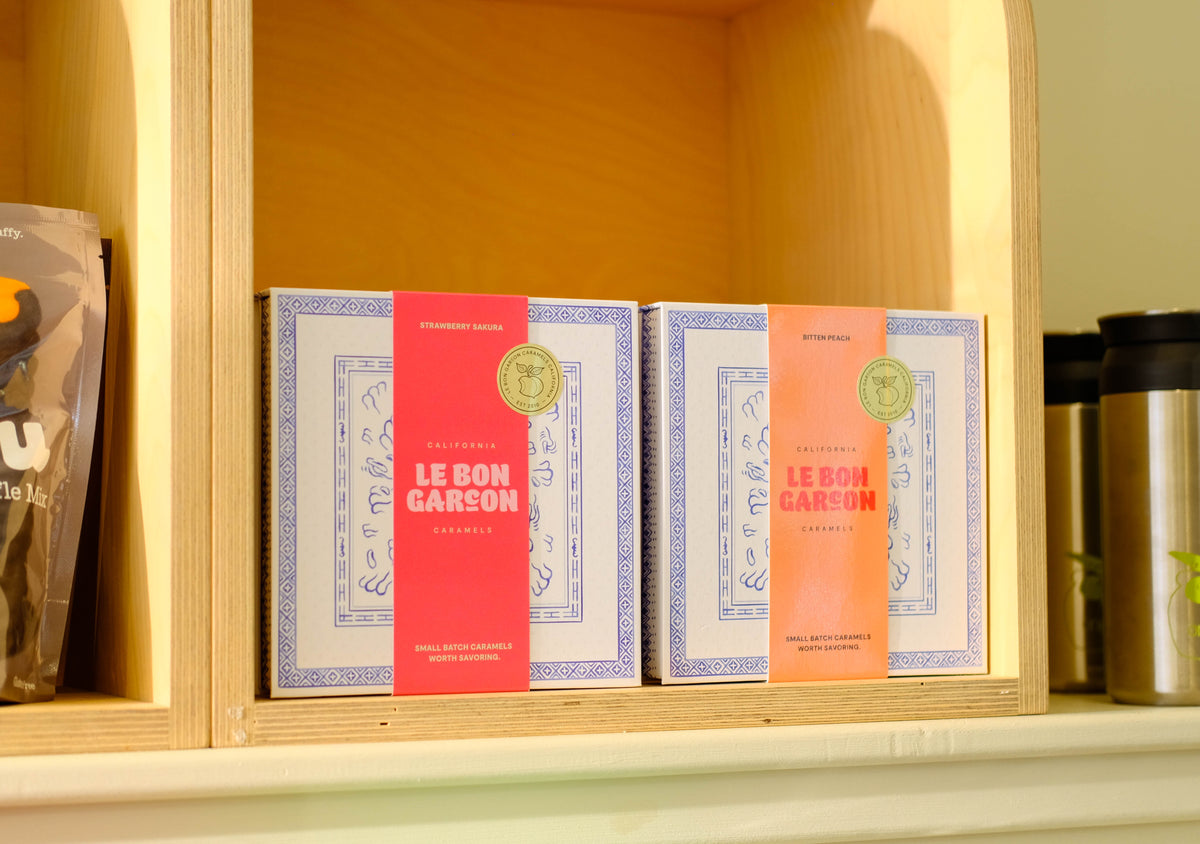 Le Bon Garcon's ode to the story of Mizi Xia and the bitten peach. This Bitten Peach caramel blends juicy peach and warm Chinese five‑spice into a creamy butter caramel, making each bite feel like a whisper of late‑summer sweetness with a little spice.