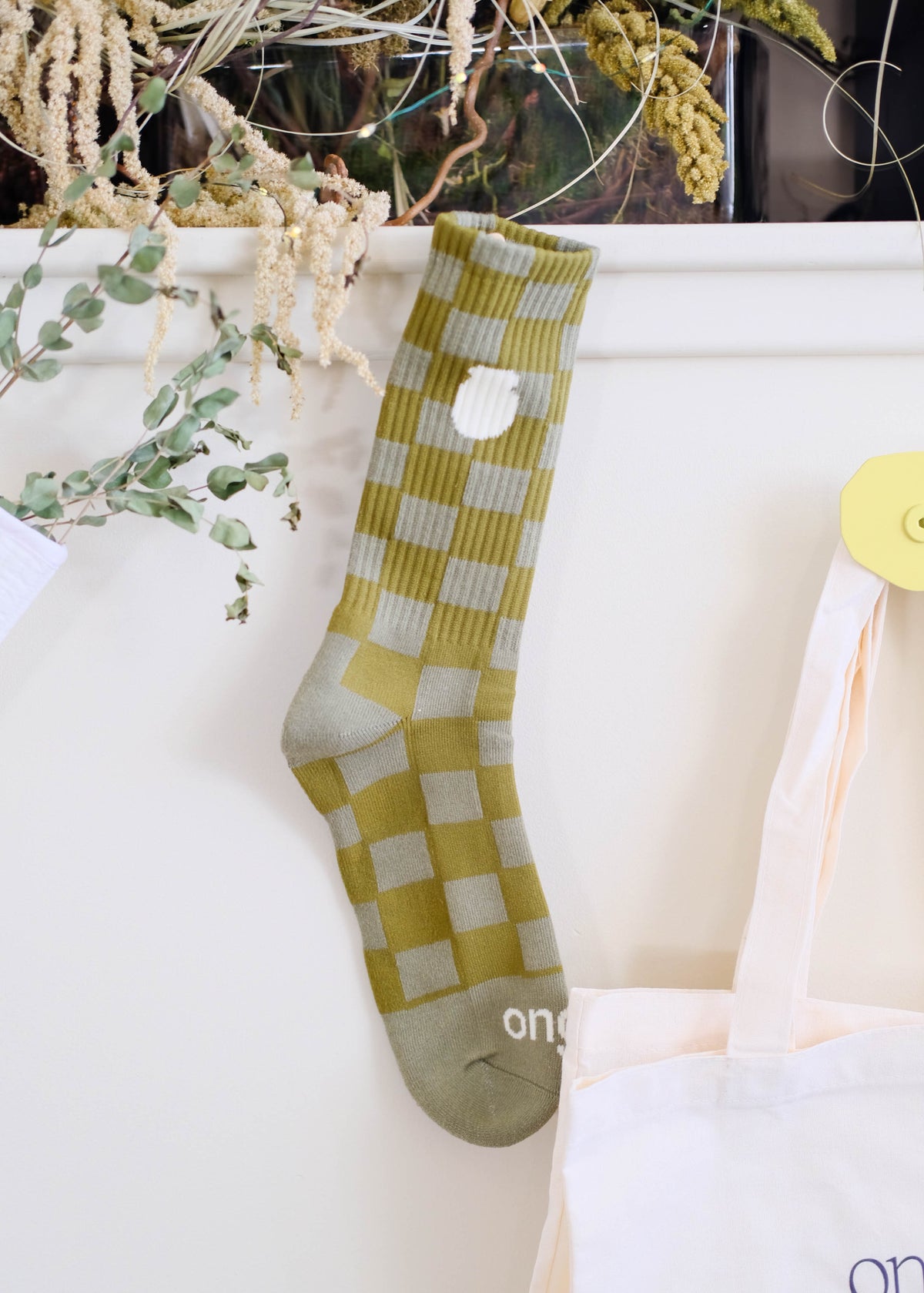 Cozy & comfy checkered socks! Cute green checkerboard with an adorable Onggi pot logo adorning each side. One size fits most.