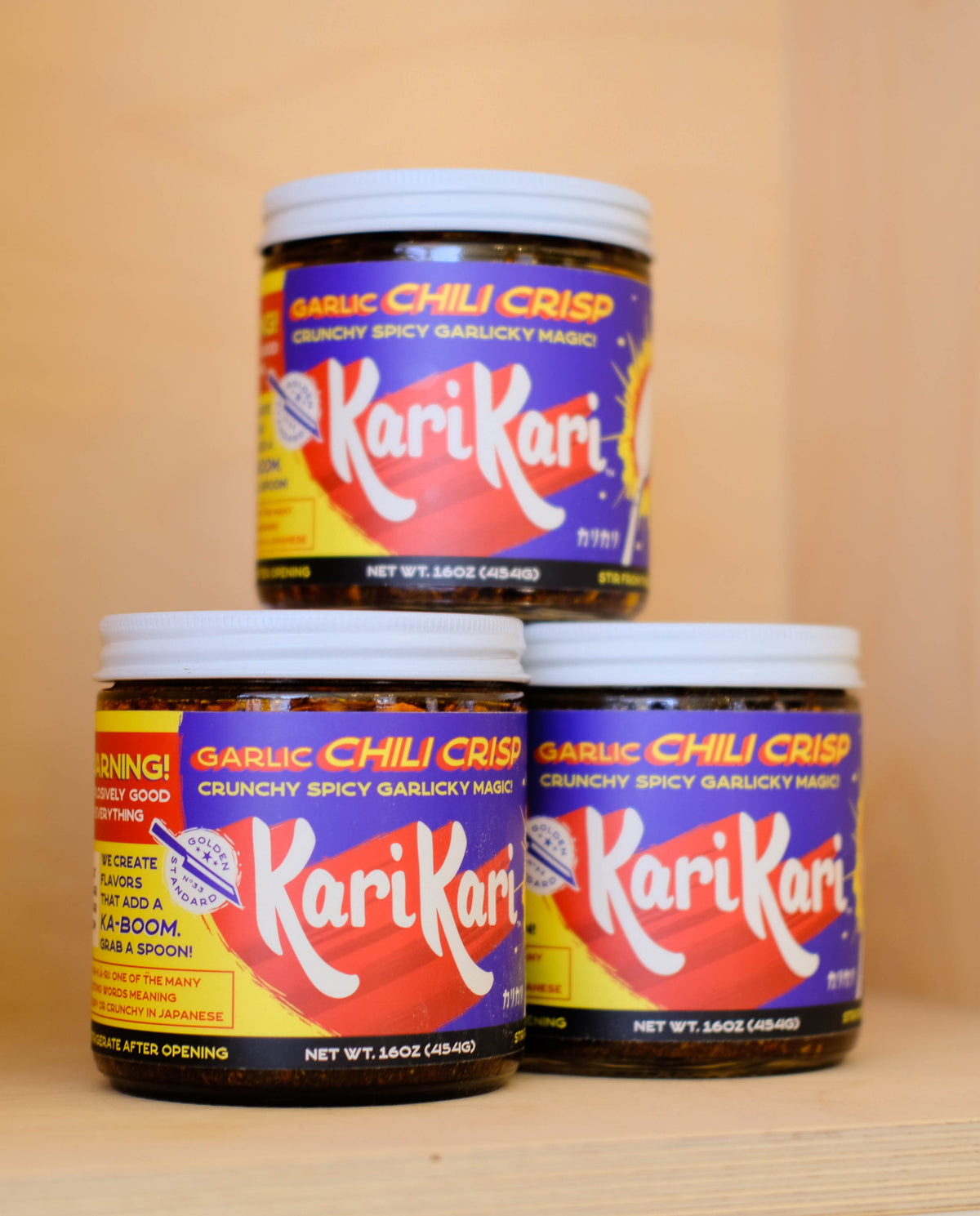 The name KariKari means "crisp" in Japanese, chosen for their grandma Yaeko. Their chili crisp brings the same playful energy and pleasure as saying karikari.